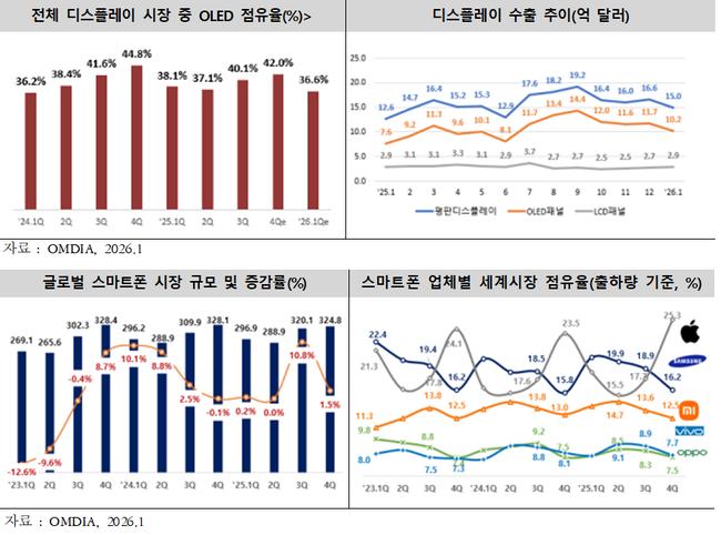 디스플레이는 15.0억 달러로 19.0% 증가했다. 모바일 신제품향 OLED 공급 확대가 반등을 이끌었다. 휴대폰은 17.6억 달러로 75.1% 늘었으며, 프리미엄 완제품 수요 호조와 부분품 수출 증가가 동시에 나타났다.