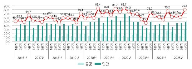 장기 흐름을 보면 건설공사 계약액은 2022년 2분기 82조 7천억 원으로 정점을 찍은 이후 감소해 2023년 3분기 45조 5천억 원까지 떨어졌으나, 이후 다시 증가세로 전환됐다. 이번 4분기 실적은 과거 최고치의 약 96% 수준까지 회복된 상태다.
