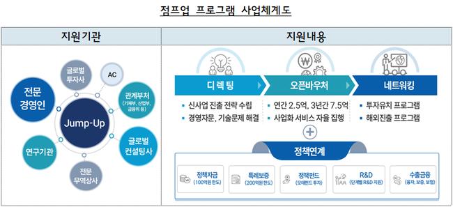 점프업 프로그램은 신사업 전략 수립부터 경영·기술 자문, 오픈바우처, 투자유치 및 해외진출 네트워킹, 정책자금 연계까지 3년간 밀착 지원하는 사업이다. 전문경영인과 글로벌 컨설팅사, 연구기관이 참여하고, 중소벤처기업진흥공단·중소기업기술정보진흥원·기술보증기금·신용보증기금 등 유관기관이 협력해 성장 전 주기를 지원하는 것이 특징이다.