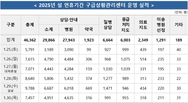 실제로 지난해 설 연휴(1월 25~30일) 동안 119를 통한 의료상담·안내는 총 4만6362건으로 집계됐다. 하루 평균 7727건으로, 2025년 평일 평균(4543건) 대비 70.1% 증가한 수치다. 설날 당일 상담 요청이 9788건으로 가장 많았다.